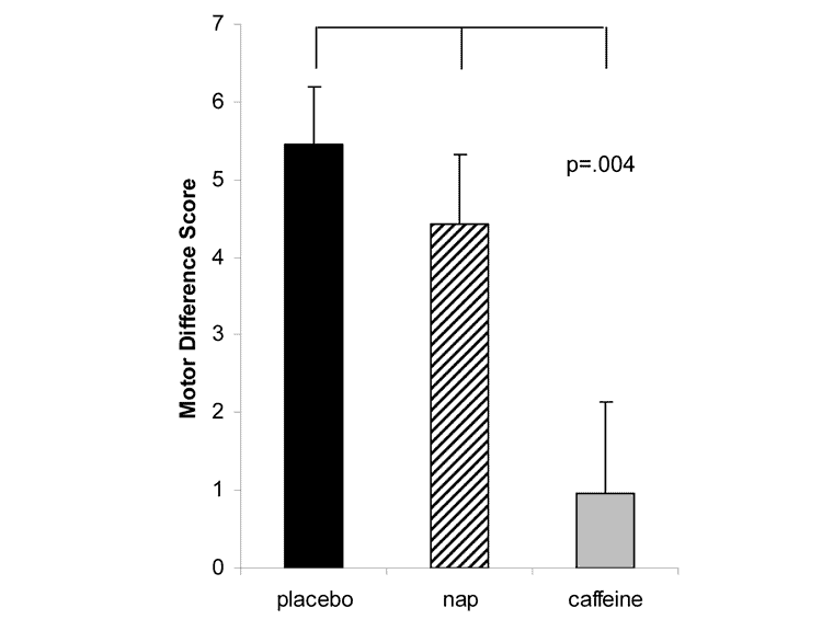 And when it came to the motor learning task, it’s almost like caffeine impaired the caffeine group’s learning. Because while the non-caffeinated participants (even the placebo group) improved their performance pretty significantly from the morning session to the afternoon session, the caffeine group’s performance stayed pretty much the same and didn’t improve much at all from morning to afternoon. Like so: